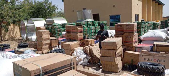 Items distributed include power tillers, herbicides, liquid fertilisers, knapsack sprayers and water pumps.